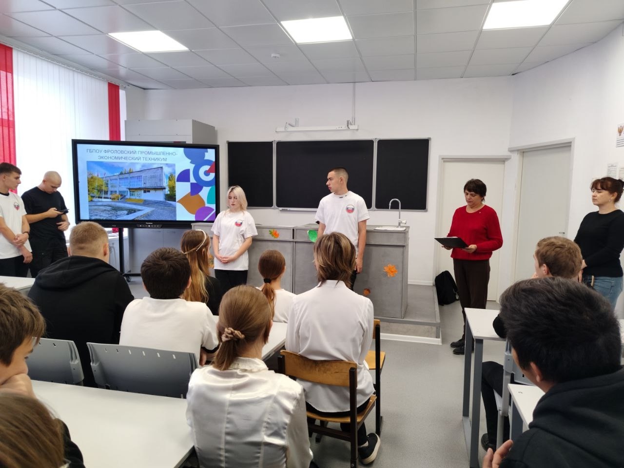 Амбасадоры профессионалитета Фроловского промышленно-экономического техникума 16 октября провели классный час «Профессионалитет: ты в хорошей компании!» в МКОУ «Средняя с углубленным изучением отдельных предметов школа №5». Учащиеся 9-ых классов с интересом ждали встречу. Федеральный проект «Профессионалитет» дает большие возможности школьникам, выбирающим среднее профессиональное образование. ГБПОУ «Фроловский промышленно-экономический техникум» входит в Строительный кластер Федерального проекта. Приходите к нам! Мы хорошему научим!