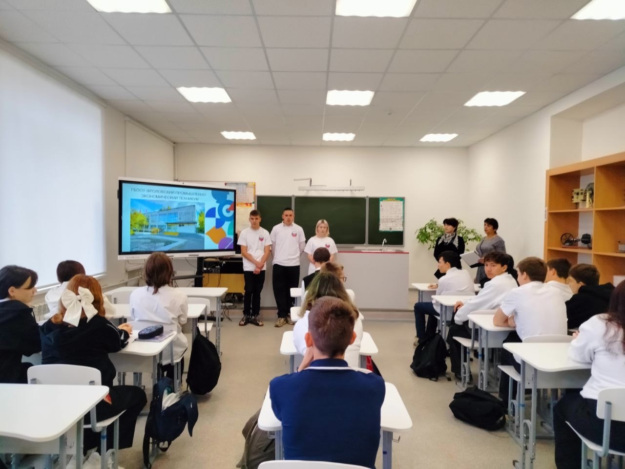 Преподаватели и студенты Фроловского промышленно-экономического техникума 17 октября снова встретились с учениками 9 –х классов МКОУ «Основная школа №4 имени Ю.А.Гагарина». На этот раз встреча состоялась благодаря классному часу «Профессионалитет: ты в хорошей компании!». Встречи способствуют информированию учащихся о рабочих профессиях и специальностях, возможности обучения по образовательным программам федерального проекта «Профессионалитет» и дальнейшем трудоустройстве. Сейчас рынок труда подстраивается под работодателей, и среднее специальное образование начинает приобретать все большую популярность. Выбирая профессию - выбираем будущее. Надеемся, что многим ребятам наши встречи помогут самоопределиться и сделать правильный выбор. Мы ждем вас!